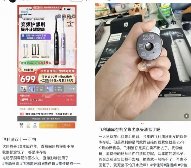 天猫淘宝"双十一"第一波活动正如火如荼。10 月 21 日,多名网友发帖质疑胡可、李佳琦直播间为品牌清"库存货":"雅诗兰黛"白金黑钻正装面霜仅剩 9 个月使用期限;"飞利浦"电动牙刷 7 系"组合套装中,黑色款为 2023 年生产。