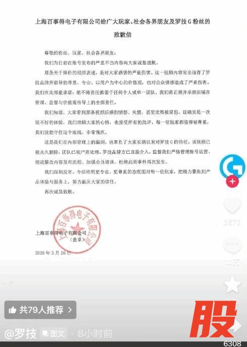 此外,有网友留意到,罗技已删除短视频平台的致歉内容。